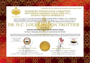 Nommée personnalité internationale de l’année 2020, j’ai aussi obtenu un doctorat honoris causa pour mes missions humanitaires de paix et pour ma créativité dans le monde (enregistré aux Nations Unies).
