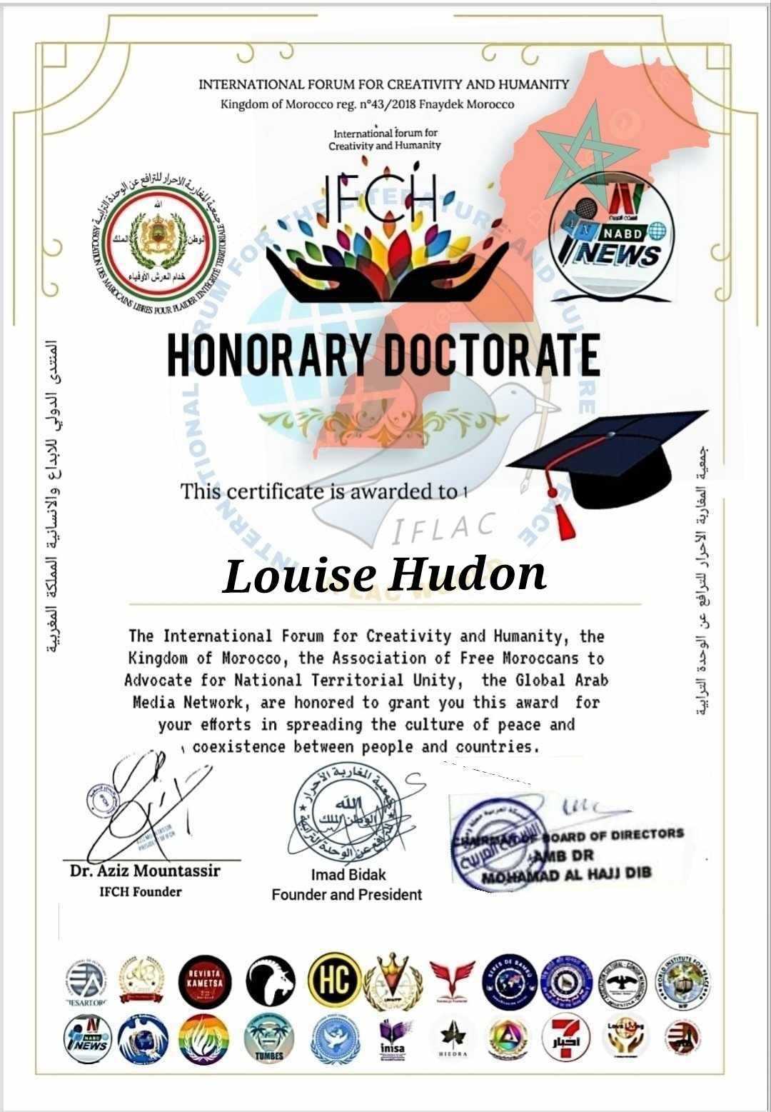 CERTIFICAT D’HONNEUR DE L’IFCH 31 mars 202531 mars 2025 | Louise Hudon Un grand merci aux organisateurs, dont monsieur Dr Aziz Mountassir. Dr H.C. Louise Hudon, poétesse du Canada et écrivaine. Mars 2025 Partager : Cliquez pour partager sur X(ouvre dans une nouvelle fenêtre) X Cliquez pour partager sur Facebook(ouvre dans une nouvelle fenêtre) Facebook J'aime chargement… En lien