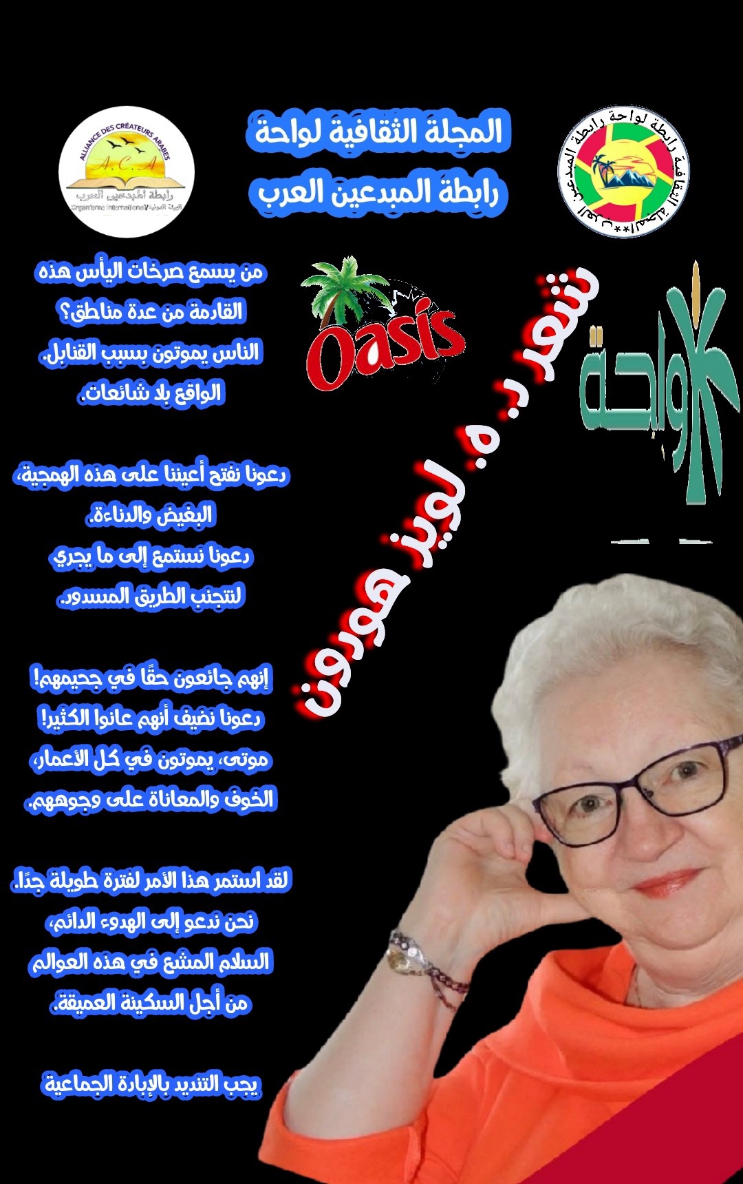 À titre d’ambassadrice culturelle internationale, avec d’autres, nous travaillons à former des ponts littéraires pour que les différentes communautés se connaissent mieux et, s’il y a lieu, s’entraident. Les mentalités sont souvent différentes mais l’amitié, l’amour, le partage, le respect se doivent de dominer toutes les religions en travaillant aux droits des enfants, à la paix dans le monde, à la fraternité, à la défense des valeurs universelles, à celle des droits de l’homme. Avec ces objectifs, nous pourrons assurer un avenir meilleur pour l’humanité. Voilà bien des années que je travaille dans ces domaines. Voici un de mes poèmes de 2016: