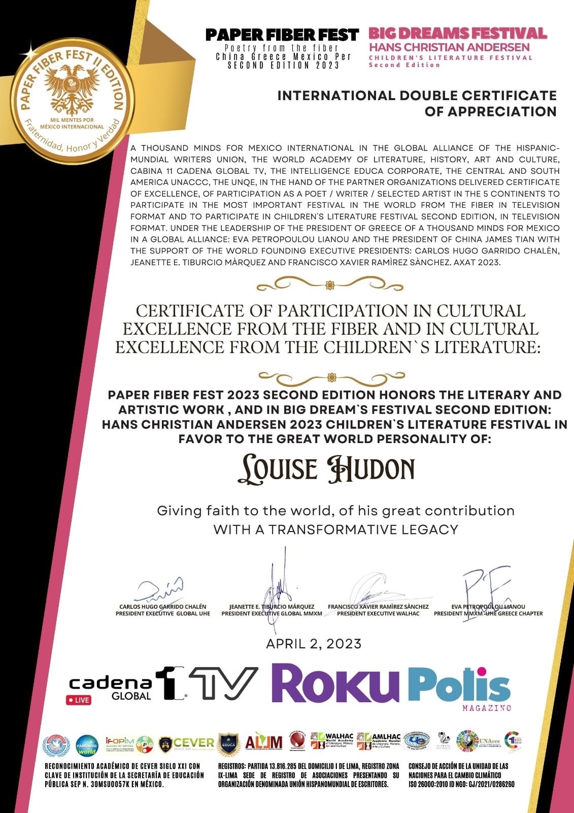 Voici quelques-uns de mes titres officiels, de mes certificats honorifiques, de mon doctorat Honoris causa :